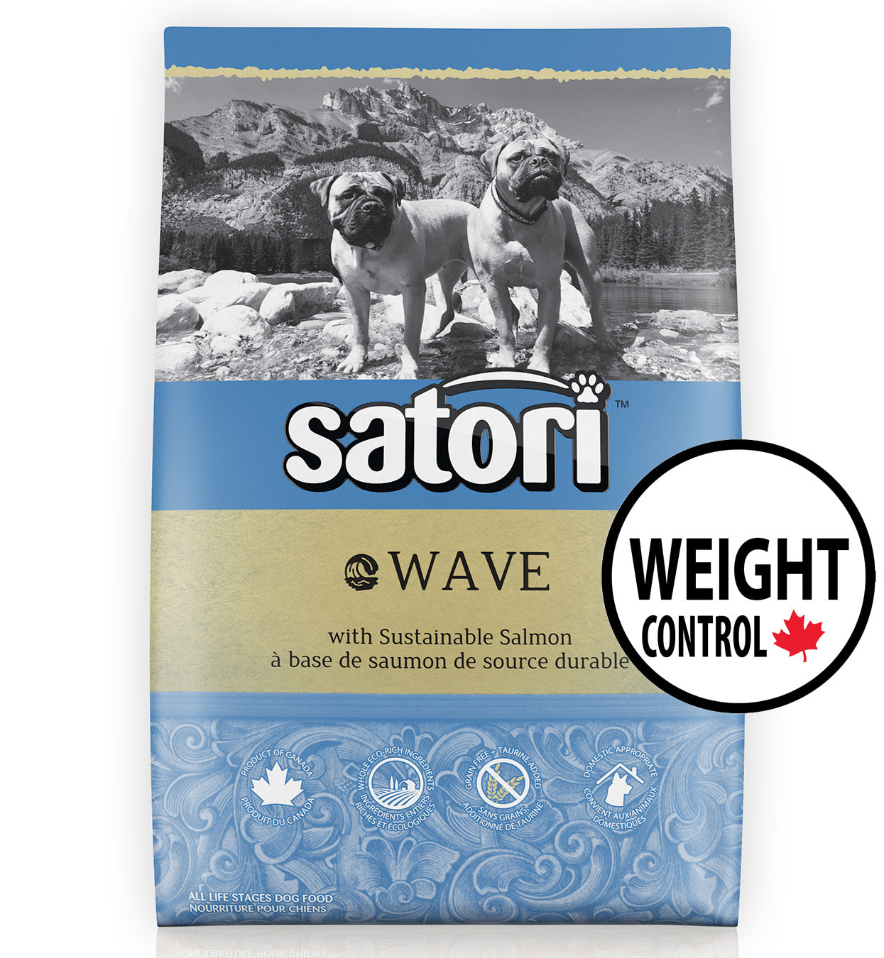 Satori Wave Salmon Recipe is the first Domestic Appropriate pet food specially designed to bridge the gap between your canine’s anatomy and modern lifestyle. Our salmon recipe has a logical approach as it considers canines, like the wolf, have digestive systems setup to efficiently process meat therefore it is grain free and made with fresh salmon. We then took it a step further by understanding our pets caloric needs are not the same as their wild ancestors since they do not travel 20-25km per day hunting and searching for food. These differences are the reason we adjusted the nutrition to fit their domestic lifestyle which consists of living in houses and backyards where their meals are served to them.